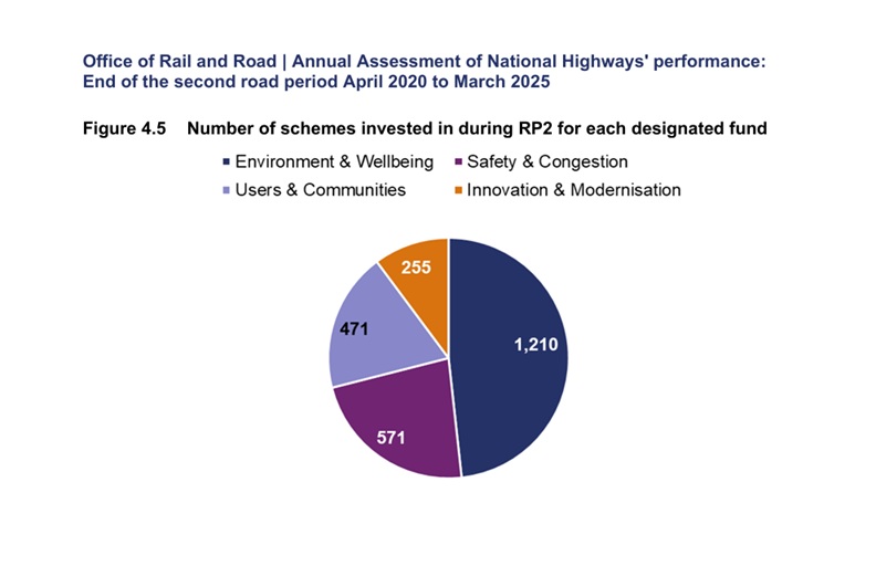 In fact, the company’s designated funds webpage for “Safety” claims that over the five years “we delivered over 570 safety schemes”, while the ORR’s Annual Assessment of National Highways’ performance: End of the second road period April 2020 to March 2025 has a chart showing that the number of schemes under the Safety and Congestion designated fund as a whole was 571 and the ORR told me that just 76 of these were safety schemes.