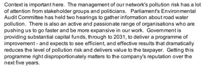 Government is providing substantial capital funds, through to 2031, to deliver a programme of improvement – and expects to see efficient and effective results that dramatically reduces the level of pollution risk and provides value for money for the taxpayer. Getting this programme right disproportionately matters to the company’s reputation over the next five years.